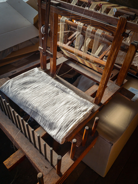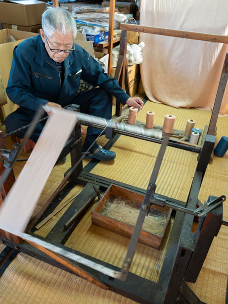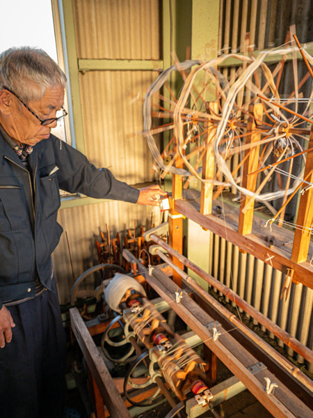 織機の幅に合わせて「羽根」という枠に糸を巻き付ける。