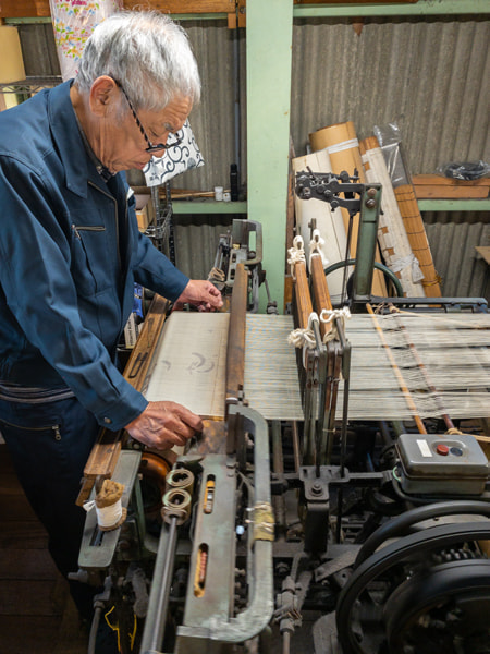 (たていと)に柄合わせをしながら織り込むと、陰影の付いた美しい柄が少しずつ現れる。